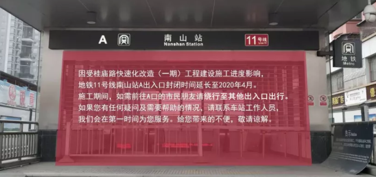乘客們也請(qǐng)注意:11號(hào)線南山站A出入口延長封閉時(shí)間至2020年4月
