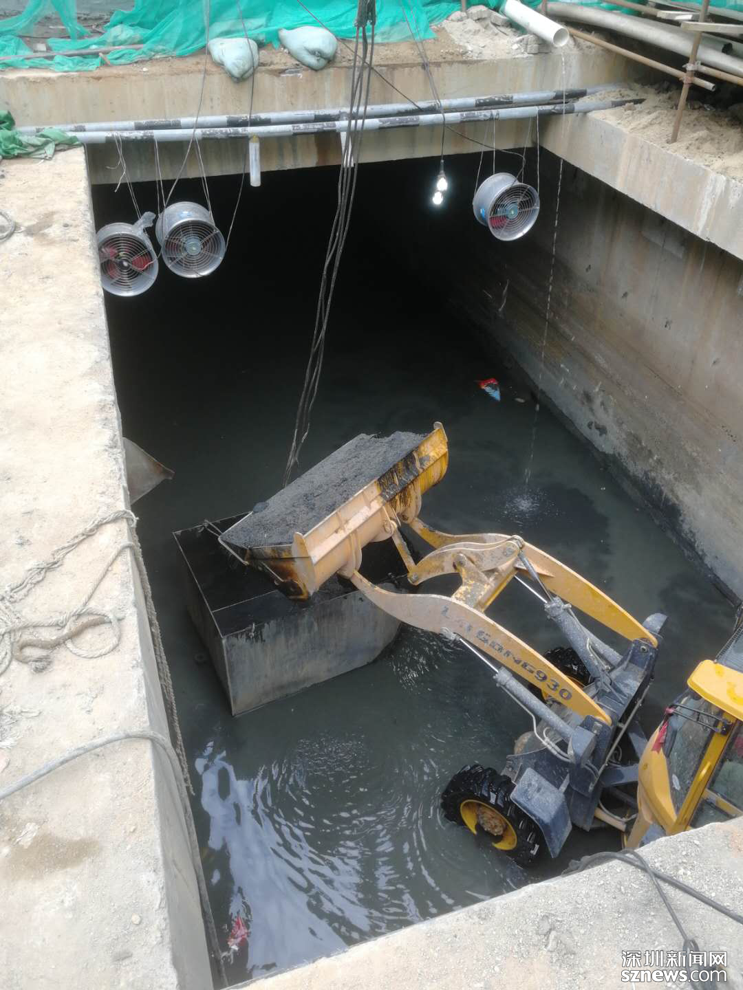 作為整個項目兩處開口之一,皇崗中學旁這片工地只有400平方米,很多大型設備無法施展開來。記者在現(xiàn)場看到,厚重的淤泥堆積有半人高,可見地下淤積情況嚴重,但現(xiàn)場堆積的淤泥并沒有令人窒息的味道,現(xiàn)場通風工作較為不錯。走近施工口記者發(fā)現(xiàn),多臺送風機在不停歇地工作,抽水設施也在將暗渠的水抽出,確保渠內(nèi)積水在安全工作線內(nèi)。