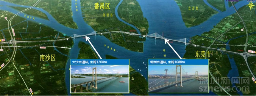 由廣東省交通集團投資建設(shè)的虎門二橋項目,全長12.89公里,雙向八車道,設(shè)計行車速度為100公里每小時,設(shè)計使用壽命100年。路線起于廣州市南沙區(qū)東涌鎮(zhèn),順接國道主干線廣州繞城高速公路南環(huán)段,同時與廣珠北線高速公路連接,經(jīng)廣州市南沙區(qū)、番禺區(qū)、先后跨越珠江大沙水道、海鷗島、坭洲水道后,穿越虎門港進入東莞市沙田鎮(zhèn),終點與廣深沿江高速公路相接,并預(yù)留與規(guī)劃中的河惠莞高速公路接口。