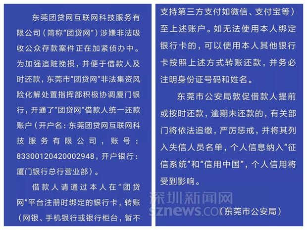 4月2日,東莞市公安局發(fā)布情況通報稱,公安機(jī)關(guān)正在加緊偵辦“團(tuán)貸網(wǎng)”涉嫌非法吸收公眾存款案件。東莞警方開設(shè)了借款人統(tǒng)一還款賬戶,敦促借款人提前或按時還款,否則將依法追繳,嚴(yán)厲懲戒,并列入失信人員名單。