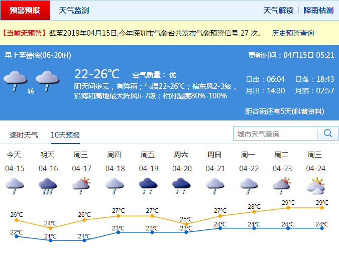 深圳新聞網(wǎng)2019年4月15日訊 記者從市氣象局了解到,15日我市有陣雨或雷陣雨,16日白天有大雨到暴雨,并伴有短時大風、雷暴和短時強降水。提醒市民,強降水時請注意遠離河道、低洼處等危險區(qū)域。