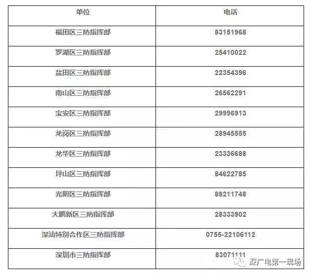 深圳市、區(qū)三防指揮部報災電話