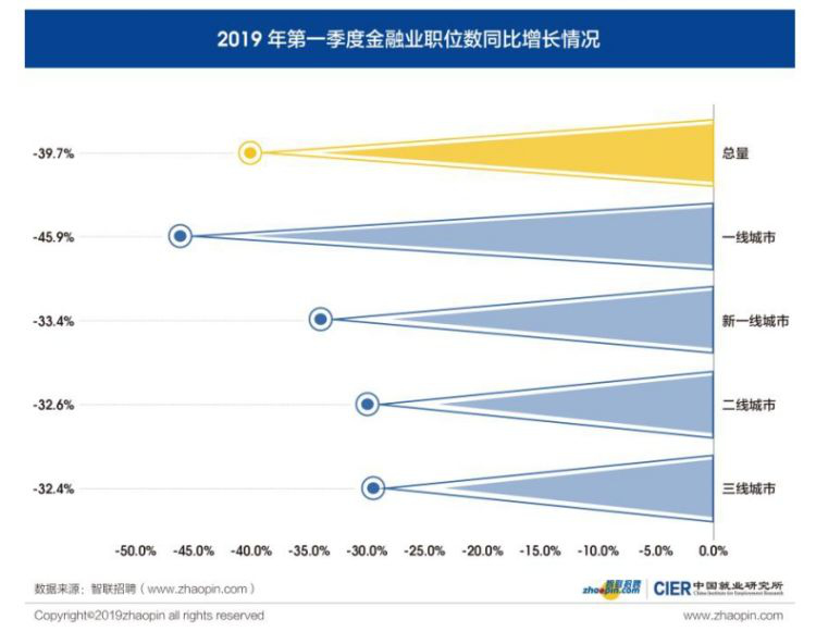 此外,調(diào)研顯示,備受矚目且高薪的金融行業(yè)本季度就業(yè)狀況并未隨著股市的回暖同步好轉(zhuǎn)。根據(jù)智聯(lián)招聘大數(shù)據(jù),金融業(yè)2019年一季度的招聘職位數(shù)降幅在所有行業(yè)中最高,達(dá)39.7%。其中一線(xiàn)城市金融行業(yè)職位數(shù)的降幅最大,為45.9%,新一線(xiàn)、二線(xiàn)和三線(xiàn)城市的降幅均在33%左右。2017年以來(lái),強(qiáng)化監(jiān)管成為金融領(lǐng)域的主基調(diào),在去杠桿、防風(fēng)險(xiǎn)的同時(shí),金融行業(yè)發(fā)展速度有所放緩,向市場(chǎng)提供的就業(yè)機(jī)會(huì)也整體下降,這在互聯(lián)網(wǎng)金融等新興業(yè)態(tài)主要活躍的一線(xiàn)城市表現(xiàn)更為明顯。