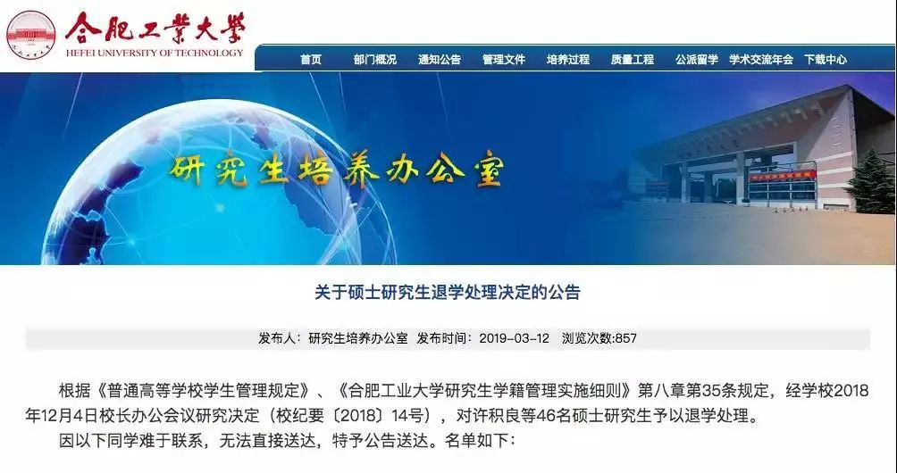 對(duì)46名碩士研究生予以退學(xué)處理,因其在學(xué)校規(guī)定的最長(zhǎng)學(xué)習(xí)年限內(nèi)未完成學(xué)業(yè),或超過學(xué)校規(guī)定期限未注冊(cè)而又無正當(dāng)理由,且未經(jīng)請(qǐng)假離校連續(xù)兩周未參加學(xué)校的教學(xué)活動(dòng)。