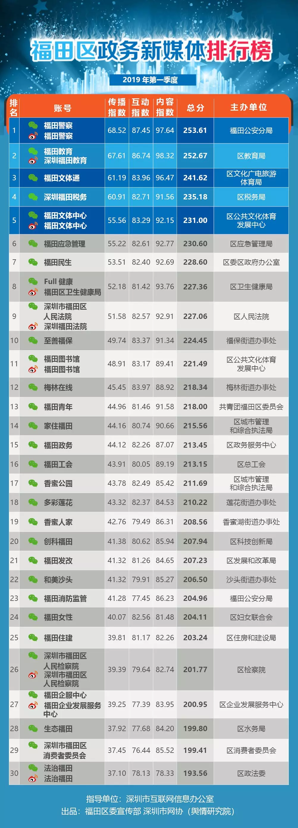 榜單根據(jù)新媒體屬性以及政務(wù)信息公開工作特點(diǎn),將福田區(qū)各政務(wù)部門及公營(yíng)單位開設(shè)的新媒體賬號(hào),按照傳播指數(shù)(100分)、內(nèi)容指數(shù)(100分)、服務(wù)指數(shù)(100分)三項(xiàng)指標(biāo)進(jìn)行綜合評(píng)價(jià),計(jì)分排名,形成榜單。