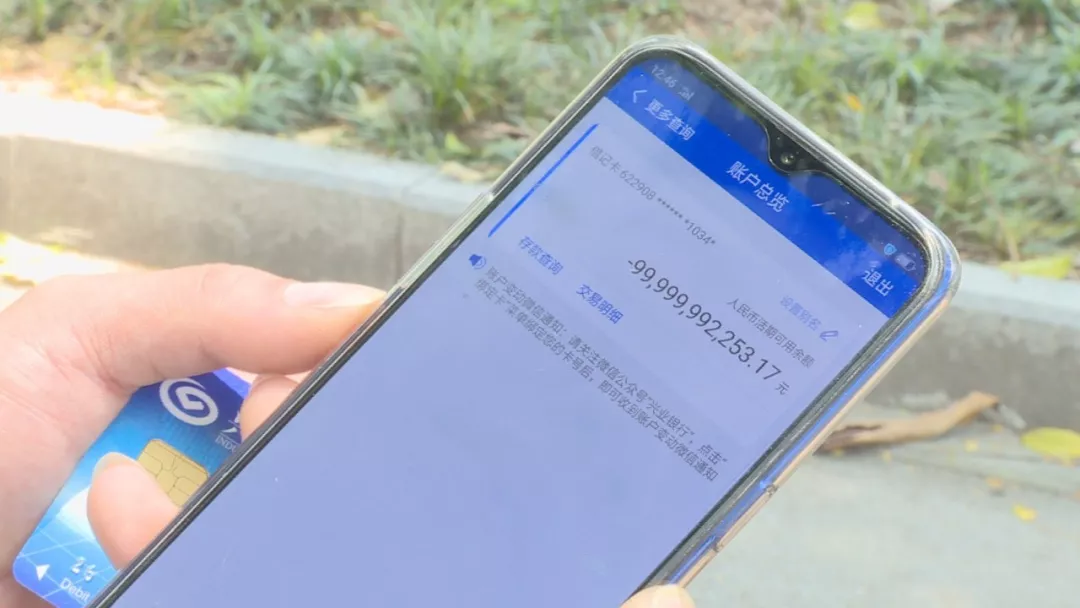 楊先生在今年2月中旬,經(jīng)朋友介紹來(lái)到深圳坪山工作,公司統(tǒng)一辦理了興業(yè)銀行的工資卡。楊先生說(shuō),第一個(gè)月發(fā)工資時(shí),他就發(fā)現(xiàn)工資取不出來(lái),就以為是銀行卡沒(méi)激活,沒(méi)在意??墒钱?dāng)?shù)?月份的工資也用不了時(shí),楊先生趕緊下載了手機(jī)銀行,這一查,嚇了一跳!賬戶(hù)余額顯示:-99,999,992,253.17 (負(fù)999億余元)。