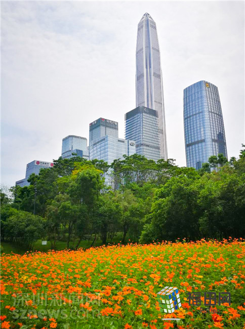 遠處的平安大廈,近處的綠樹、花海,構(gòu)成了一副靜謐美好的畫面。