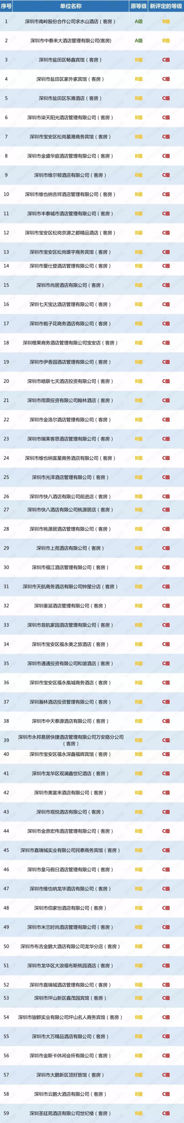 深圳新聞網(wǎng)2019年5月6日訊(記者 劉夢(mèng)婷)日前,記者從深圳的衛(wèi)監(jiān)局獲悉,為保障市民和來(lái)深旅客的健康權(quán)益,自2018年12月下旬開(kāi)始,深圳市衛(wèi)生監(jiān)督部門(mén)集中開(kāi)展專項(xiàng)整治行動(dòng),行動(dòng)中共檢查1660家酒店業(yè)單位,責(zé)令限期整改224家,立案95宗,共有59家單位在衛(wèi)生信譽(yù)等級(jí)評(píng)定復(fù)審工作中,被予以“降級(jí)”。據(jù)了解,2家原衛(wèi)生量化A級(jí)單位被降為B級(jí),57家原衛(wèi)生量化B級(jí)單位被降為C級(jí),其中不乏部分知名連鎖酒店業(yè)單位,如七天、維也納等品牌。