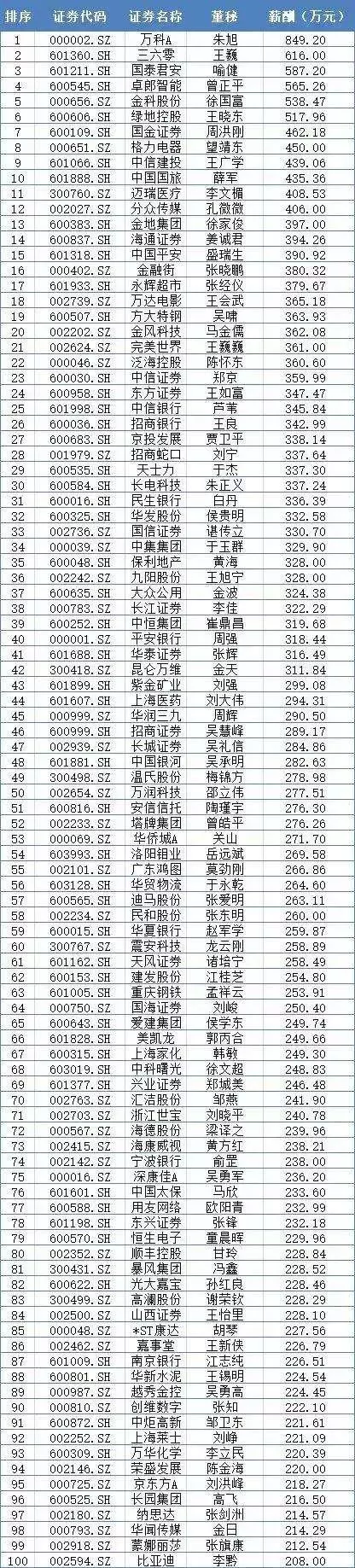 在2018中國A股上市公司董秘薪酬榜上,榜首為萬科A的董秘朱旭,其2018年的年薪為849萬元人民幣。三六零的王巍、國泰君安的喻健則位居第二、第三名,年薪分別是616萬元人民幣、587萬元人民幣。