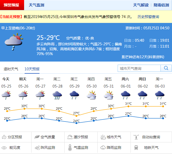 深圳新聞網(wǎng)2019年5月25日訊 5月24日深圳天氣平穩(wěn),全市最高氣溫不到30 ℃,說好要來的雨也"爽約"了,僅僅在光明和寶安灑了一些雨水。接下來深圳天氣如何?預(yù)計未來三天多云為主,局地有短時強(qiáng)降水,市民出行注意攜帶雨具。