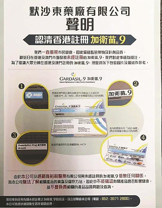 早前,HPV(全稱人乳頭狀瘤病毒)九價疫苗生產(chǎn)商默沙東藥廠曾發(fā)出聲明,把其公司指定的代理商,從未供應(yīng)任何“HPV九價預(yù)防疫苗”(GARDASIL9加衛(wèi)苗9)予位于佐敦嘉賓商業(yè)大廈的環(huán)亞體檢集團(最早被投訴給內(nèi)地客人打水貨疫苗的公司)。