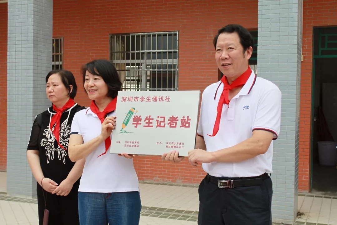 在捐贈(zèng)儀式上,同學(xué)們?yōu)檫h(yuǎn)道而來的叔叔阿姨系上了紅領(lǐng)巾,這些“大紅領(lǐng)巾”陪著“小紅領(lǐng)巾”,提前歡慶六一兒童節(jié)的到來??偵邕€為雅色的孩子帶來一份大禮,那就是深圳學(xué)通社學(xué)生記者站在頌平小學(xué)掛牌。