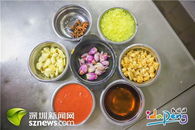 準(zhǔn)備好五花肉和燜好的芋頭,五花八門的材料也準(zhǔn)備輪番上場。歐石林將八角、料酒、醬油、鹽、姜蓉、蔥頭、蒜頭、南乳、片糖粒和花生油等細(xì)心地按比例分配在每個(gè)調(diào)料碟里,在他看來,一道好菜正是這些調(diào)料的“秀場”,但拿捏精準(zhǔn)卻不是件易事。
