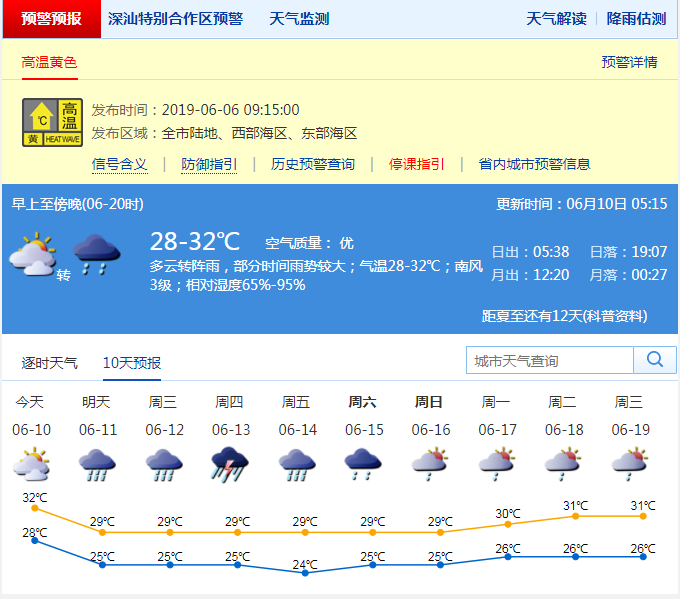 深圳新聞網(wǎng)2019年6月10日訊 在近幾日副熱帶高壓的影響下,深圳迎來了久違的“深圳藍(lán)”。不過,市民們在享受通透的藍(lán)天夏日的同時,也承受著不斷升溫的“燒烤模式”。2019年6月6日上午09時15分深圳市氣象臺發(fā)布了今年的首個高溫黃色預(yù)警信號,2019年6月9日羅湖區(qū)東門自動站記錄到36.2℃高溫。氣溫圖上一片橙色紅色,簡直成了一只“紅燒雞腿”。