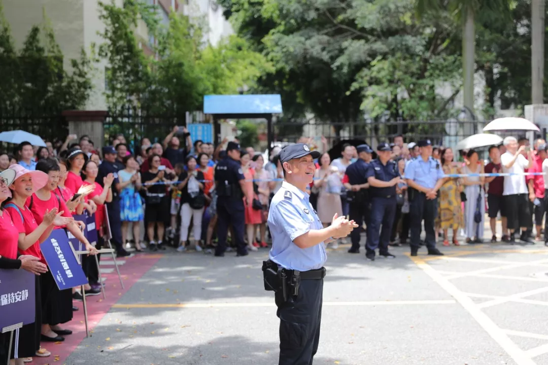 △當(dāng)?shù)谝晃豢忌叱錾钲趯?shí)驗(yàn)學(xué)校中學(xué)部考場時,通心嶺派出所所長林志強(qiáng)與現(xiàn)場家長為其鼓掌喝彩。