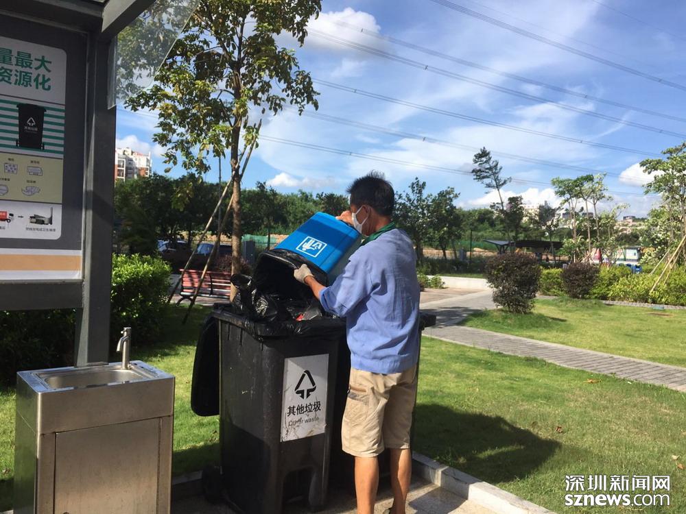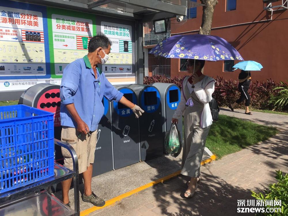 鄧伯今年60歲,是來深圳帶孫子的,因為老伴能幫忙,所以他應聘成為了一名小區(qū)清潔員。小區(qū)實行垃圾分類一年多以來,鄧伯工作輕松了很多。每天他只需巡視幾遍垃圾桶,將滿了的垃圾裝在框里帶回暫存點,進行二次分揀和清洗后,再將垃圾桶歸放原處;等物業(yè)在微信平臺上聯(lián)系好運送車輛,協(xié)助運送人員運走垃圾就行。