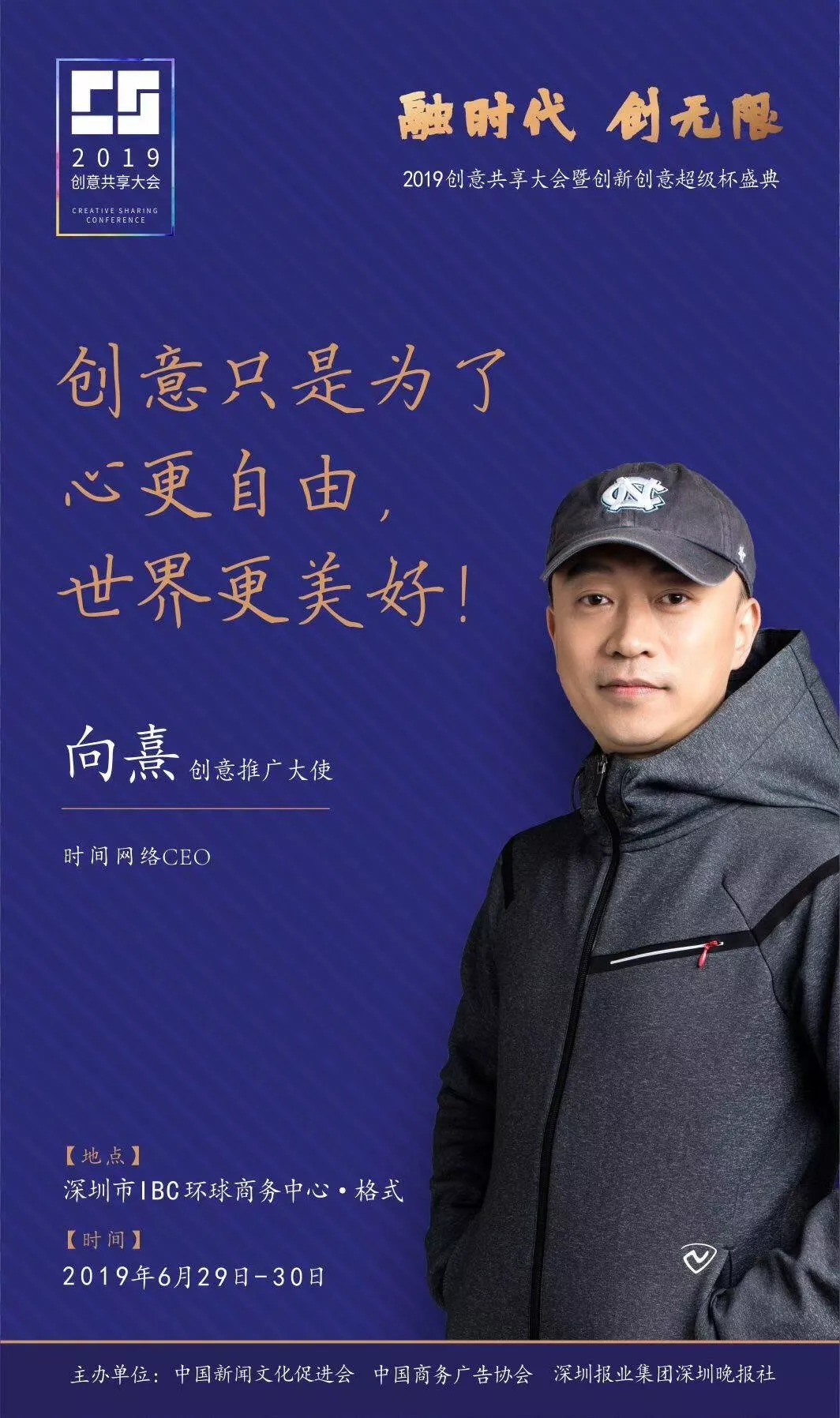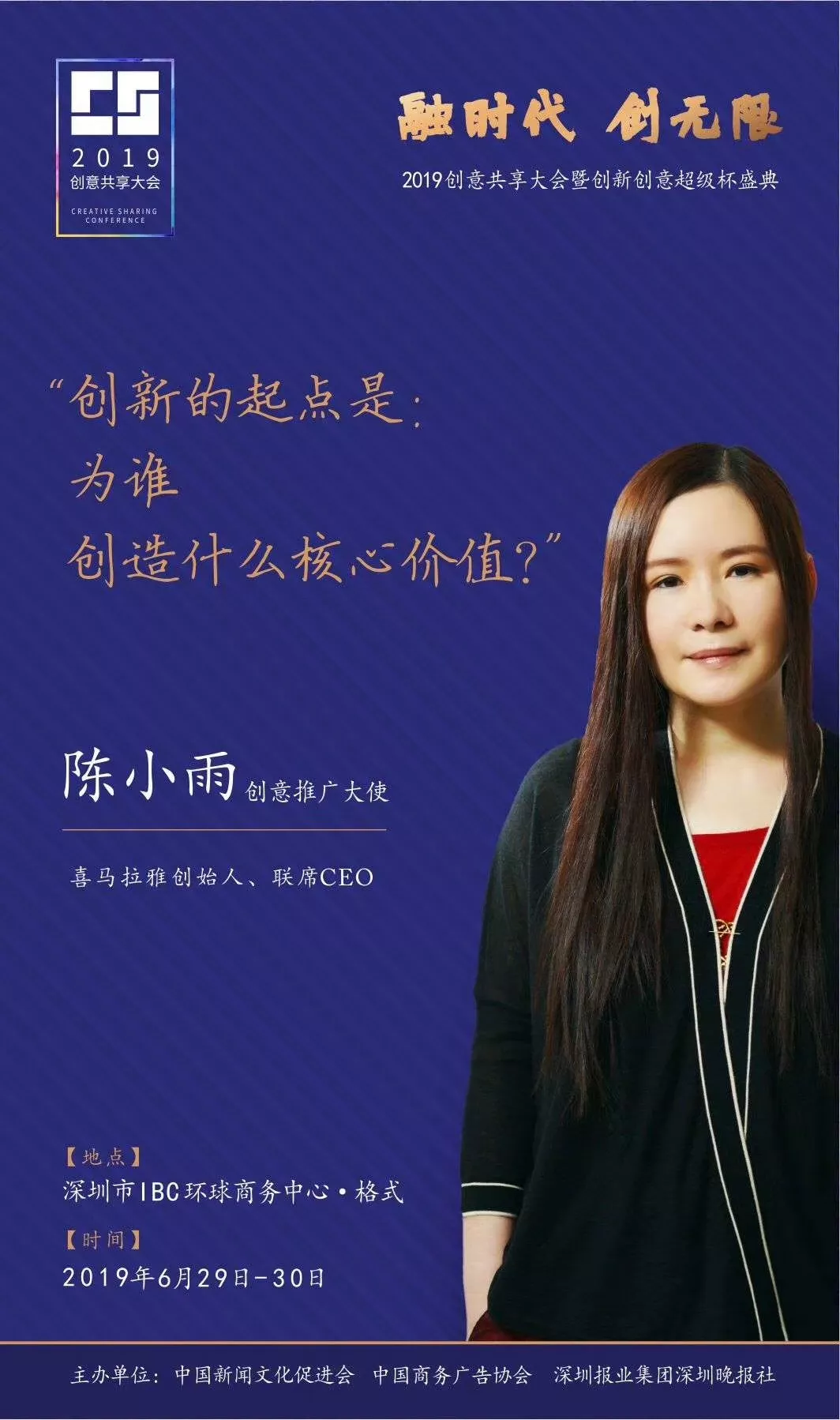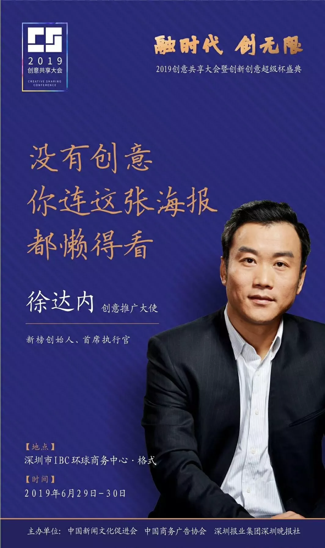 為了展現(xiàn)創(chuàng)意中國的精神風(fēng)貌和創(chuàng)意傳媒的文化力量,構(gòu)建創(chuàng)新創(chuàng)意共同體,擘畫美好圖景和未來趨勢,2019年6月29日至30日,由中國新聞文化促進(jìn)會(huì)、中國商務(wù)廣告協(xié)會(huì)、深圳報(bào)業(yè)集團(tuán)深圳晚報(bào)社等聯(lián)合主辦的“融時(shí)代創(chuàng)無限——2019創(chuàng)意共享大會(huì)暨創(chuàng)新創(chuàng)意超級杯盛典”將在深圳市IBC環(huán)球商務(wù)中心隆重舉辦。