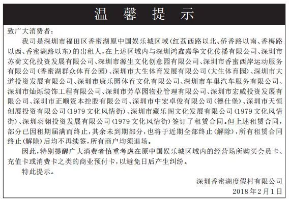 2018年2月1日,深圳香蜜湖度假村有限公司(原香蜜湖中國(guó)娛樂城區(qū)域的出租人)發(fā)布了所有商戶均須退場(chǎng)的公告。