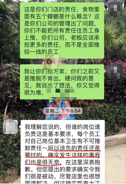 康先生拍了現場的照片,因為隔著杯蓋,可以看到有多個小黑點,但很難一眼辨認出是小蟑螂。不過,從康先生提供的微信聊天記錄可以看出,店方承認他們員工有疏忽,也派負責人跟康先生溝通賠償問題??迪壬硎镜昙以敢赓r償1000元,但他感覺對自己的精神影響很大,并不同意。