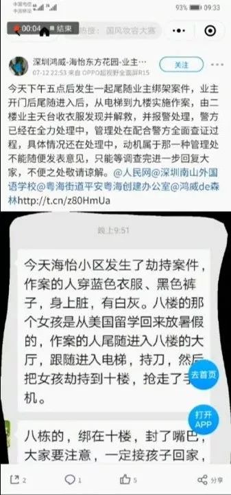 帖子下方跟著很多聊天截圖,透露被尾隨的業(yè)主是個年輕女孩,“嫌疑人持刀把女孩劫持到十樓,搶走手機”,女孩被“封住嘴巴”,還說“嫌疑人在小區(qū)內(nèi)轉了很久尋找目標”。記者今天中午來到位于南山科技園南區(qū)的涉事小區(qū),業(yè)主們說這事讓他們很震驚。