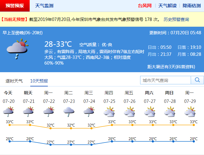 深圳市氣象局提醒市民,20日可能出現(xiàn)雷雨大風(fēng)等強(qiáng)對(duì)流天氣,請(qǐng)注意防范局地雷擊、短時(shí)強(qiáng)降水和短時(shí)大風(fēng)的影響。 多雷雨天氣,請(qǐng)市民安排出行與戶外活動(dòng)時(shí),應(yīng)及時(shí)關(guān)注最新預(yù)警預(yù)報(bào)信息,提前做好防御措施。