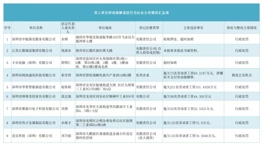 記者了解到,2019年第二季度深圳市人力資源部門繼續(xù)加大對欠薪等勞動保障違法行為的打擊力度,依法處罰,對涉嫌犯罪的堅決移送司法機(jī)關(guān),切實維護(hù)勞動者的合法權(quán)益。為加強(qiáng)對違法用人單位的社會監(jiān)督,強(qiáng)化誠信體系建設(shè),加大威懾力,依據(jù)《廣東省用人單位重大勞動保障違法行為社會公布暫行規(guī)定》和《深圳市勞動保障違法信息公布辦法》,現(xiàn)將部分區(qū)(新區(qū))人力資源部門查處的一批勞動保障違法案件予以公布。