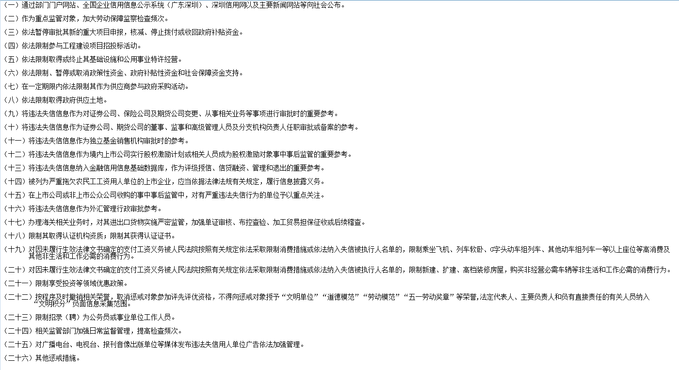 除此之外,深圳還實施了拖欠農(nóng)民工工資“黑名單”制度。用人單位出現(xiàn)克扣、無故拖欠一名勞動者三個月以上工資報酬,數(shù)額累計二萬元以上,且經(jīng)行政處罰(處理)的;克扣、無故拖欠十名以上勞動者的勞動報酬且數(shù)額累計在十萬元以上,且經(jīng)行政處罰(處理)的;涉嫌構(gòu)成拒不支付勞動報酬罪,案件被移送公安機(jī)關(guān),且公安機(jī)關(guān)受理立案的;因拖欠工資違法行為引發(fā)群體性事件、極端事件造成嚴(yán)重不良社會影響,且經(jīng)行政處罰(處理)的具體情況時,會被列入黑名單。