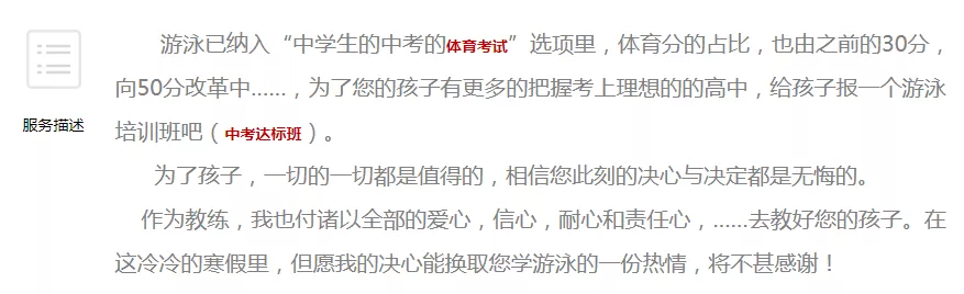 小編了解到,目前的游泳報(bào)考生大多是從小在校外自費(fèi)訓(xùn)練,多年來需要花費(fèi)高額學(xué)費(fèi)及投入大量精力。盡管新的中考體育考試辦法尚未確定,但不少商業(yè)培訓(xùn)機(jī)構(gòu)已嗅到商機(jī),迅速做出了反應(yīng)。深圳幾家大型培訓(xùn)機(jī)構(gòu)網(wǎng)站上,針對(duì)不同年級(jí)適用的中考項(xiàng)目一一列出,最新的《征求意見稿》也被貼在了2022年中考部分,并強(qiáng)調(diào)對(duì)擬新增的項(xiàng)目同樣提供相關(guān)服務(wù)。小編網(wǎng)上隨手一搜,到處都是游泳培訓(xùn)班的廣告: