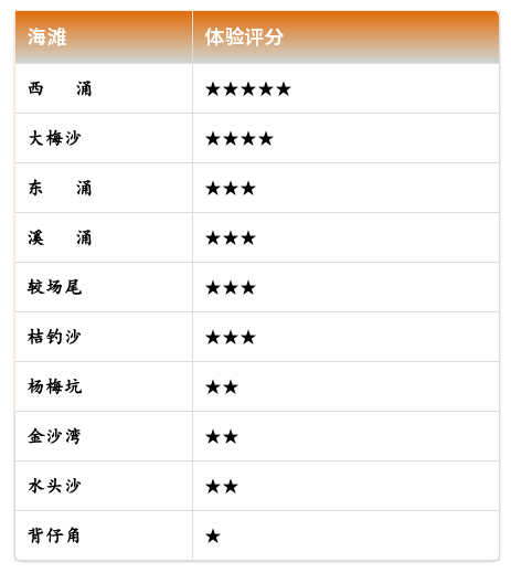 連日來,記者兵分多路,以自西向東、距離市區(qū)“由近及遠(yuǎn)”的方向沿海暴走,對(duì)其中10個(gè)知曉率最高的海灘進(jìn)行體驗(yàn)式走訪,以“開放情況、是否收費(fèi)、能否停車、便民服務(wù)、沙灘清潔、海域安全”六個(gè)方面為指標(biāo),以五星為滿分進(jìn)行了好感度評(píng)分。