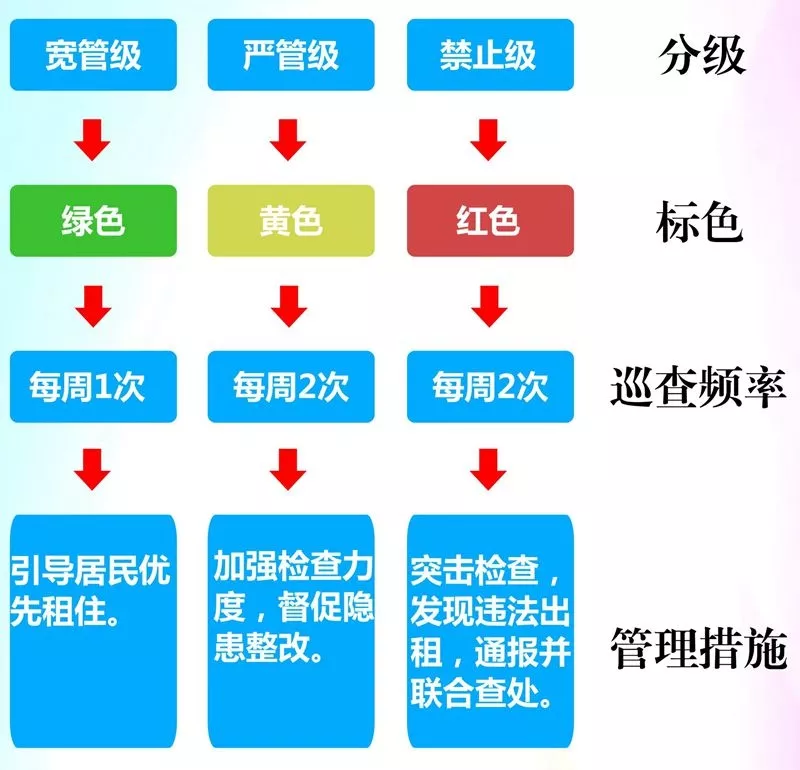 出租屋將分為寬管級(綠標(biāo))、關(guān)注級(黃標(biāo))、嚴(yán)管級(橙標(biāo))、禁止級(紅標(biāo))四個級別。結(jié)合房屋二維碼對四個級別實(shí)行動態(tài)標(biāo)色管理,以房屋二維碼的底色來標(biāo)注。