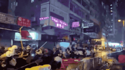 ④25日晚,激進(jìn)示威者在荃灣沙咀道與警方發(fā)生沖突,一度向警員進(jìn)逼,警方后退。危急之下,現(xiàn)場(chǎng)至少有3名警察拔槍,現(xiàn)場(chǎng)傳出槍聲。