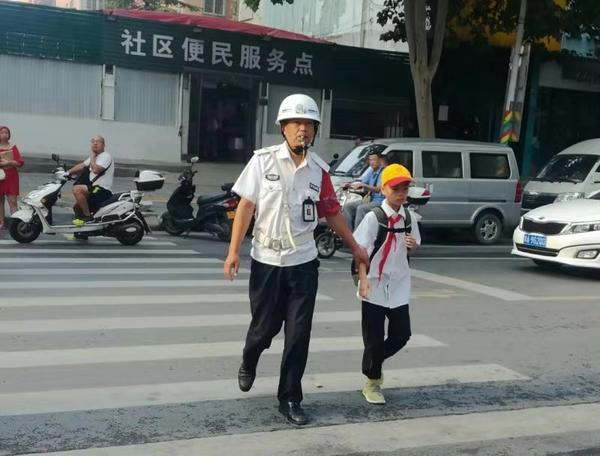 不停地牽手護送剛開學的學生過馬路。