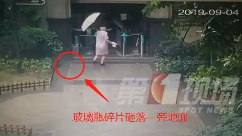 由于下雨天氣,所幸破裂的啤酒瓶砸在了雨傘上,最終從沈女士左側(cè)身旁滑落,沈女士也沒(méi)有受到傷害。