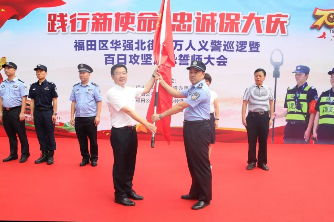 在大會上,福田公安分局副局長譚慶彬表示:“組織義警隊伍開展大巡邏大防控,重點在于拓寬人民群眾參與社會治安防控渠道,最大限度挖掘群防群治社會資源,形成多層次、全方位的群防群治網(wǎng)絡(luò),進(jìn)一步實現(xiàn)各類警情持續(xù)下降、治安難點有效整治、立體防控更加完善、安保維穩(wěn)平穩(wěn)可控、人民滿意度不斷提升的工作目標(biāo)。我們要最大限度地動員和實現(xiàn)社會力量參與平安建設(shè),筑牢社會治安防控體系,以制度化、規(guī)范化、精細(xì)化、專業(yè)化的管理,鍛造出一支拉得出、沖得上、打得贏的華強北‘義警’鐵軍,為福田社會經(jīng)濟發(fā)展?fàn)I造更加安全、平穩(wěn)、有序的生產(chǎn)、生活環(huán)境?!?/p>