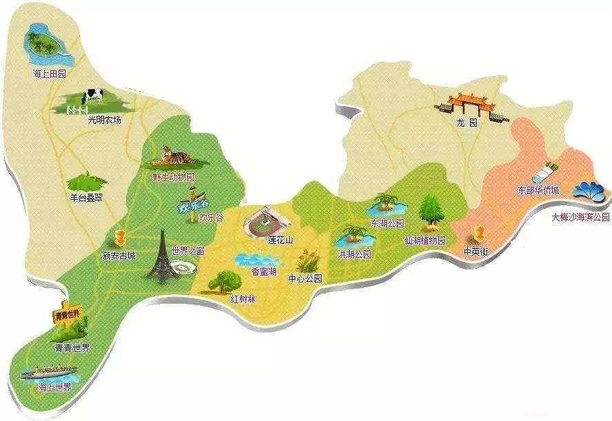 大小梅沙、大鵬片區(qū)、東部華僑城、寶安鳳凰山、仙湖植物園、紅樹林、世界之窗、蓮花山、東湖公園、福田農(nóng)批市場(chǎng)