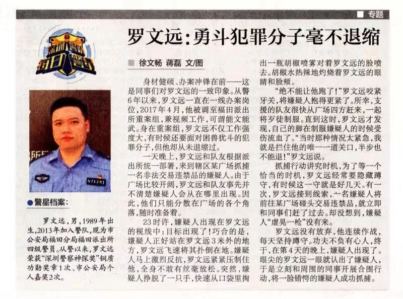 羅文遠(yuǎn),男,1989年出生,2013年加入警隊(duì),現(xiàn)為深圳市公安局福田分局福田派出所四級(jí)警員。從警以來,羅文遠(yuǎn)榮獲“深圳警察神探獎(jiǎng)”銅質(zhì)功勛獎(jiǎng)?wù)?次、市公安局個(gè)人嘉獎(jiǎng)2次。