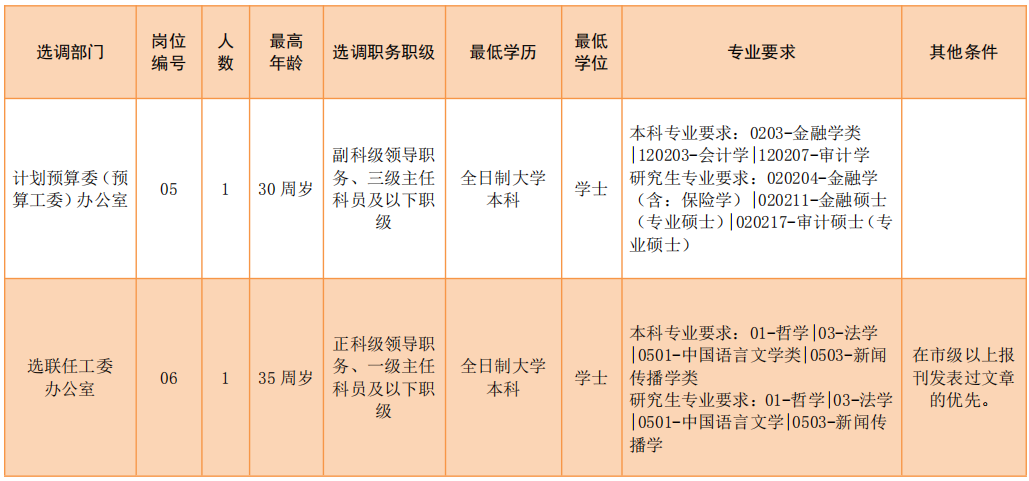 選調(diào)條件要求具有3年以上公務(wù)員工作經(jīng)歷(含試用期),已進行公務(wù)員登記,且歷年公務(wù)員年度考核為稱職及以上等次。全日制普通高校大學(xué)本科以上學(xué)歷,學(xué)士以上學(xué)位。副科級領(lǐng)導(dǎo)職務(wù)、三級和四級主任科員、一級科員年齡在30周歲以下(1988年9月30日以后出生),正科級領(lǐng)導(dǎo)職務(wù)、一級和二級主任科員年齡在35周歲以下(1983年9月30日以后出生)等。