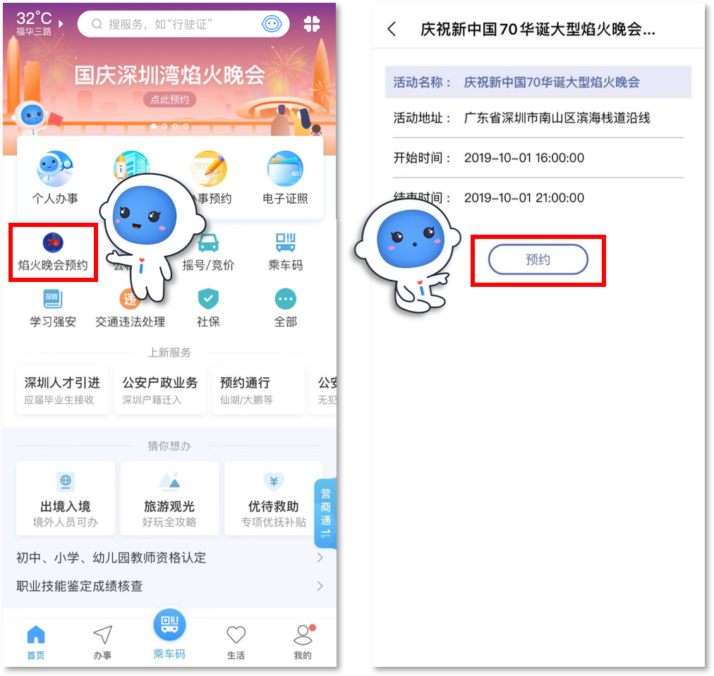 1.關(guān)注“深圳公安”微信公眾號(hào),選擇“民生”欄,點(diǎn)擊焰火晚會(huì)預(yù)約,通過人臉認(rèn)證后即可進(jìn)入預(yù)約頁面,如下圖所示: