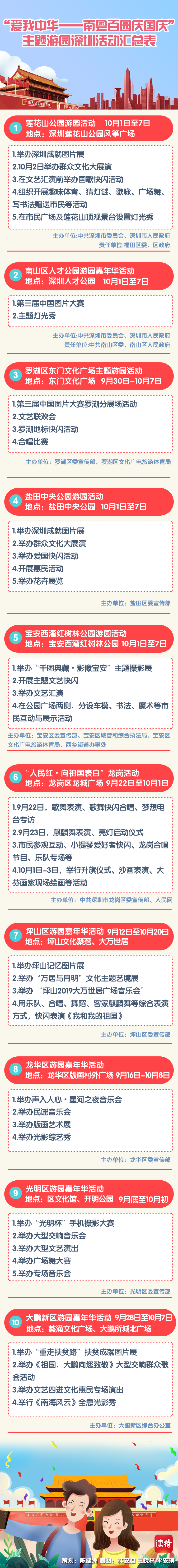 深圳特區(qū)報(bào)2019年9月26日訊 為熱烈慶祝中華人民共和國(guó)成立70周年,深圳市將舉辦規(guī)模盛大的全市性專場(chǎng)音樂會(huì)、群眾文藝晚會(huì)、焰火晚會(huì)等活動(dòng),同時(shí)將在各區(qū)舉辦80場(chǎng)“我和我的祖國(guó)”國(guó)慶群眾文藝嘉年華活動(dòng),并在全市各區(qū)舉行“愛我中華——南粵百園慶國(guó)慶”主題游園。各有關(guān)活動(dòng)安排如下:
