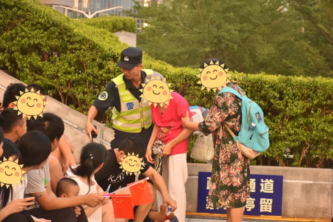 10月2日燈光秀現(xiàn)場,深圳市公安局福田公安分局機動訓(xùn)練大隊摩托車中隊隊員幫助年邁的老奶奶尋找合適的觀燈位置。