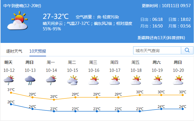 市氣象局預(yù)計(jì),12日多云轉(zhuǎn)陣雨或雷陣雨;13-15日受弱冷空氣影響,有陣雨或雷陣雨,沿海、高地和海區(qū)最大陣風(fēng)7-8級,氣溫下降2-4℃;16日起轉(zhuǎn)干燥天氣。