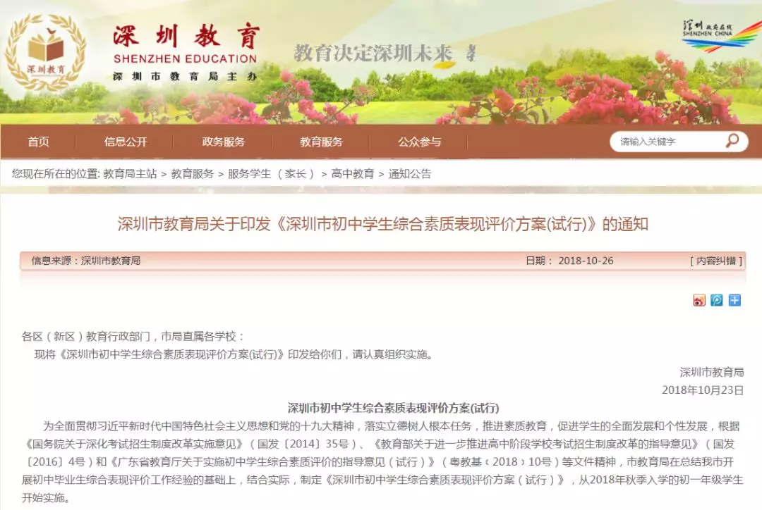 《深圳市初中學(xué)生綜合素質(zhì)表現(xiàn)評價方案(試行)》(以下簡稱《綜評方案》)于2018年10月印發(fā)。