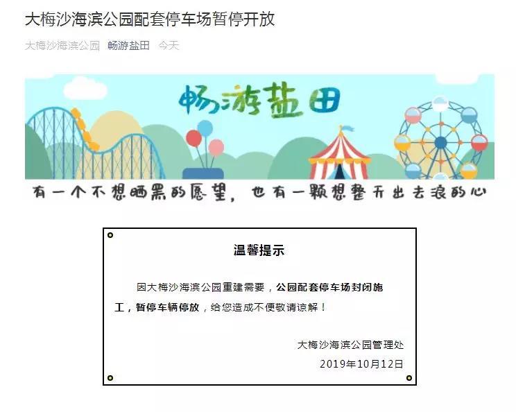 另外,大梅沙海濱公園管理處2019年10月12日發(fā)布公告稱:因大梅沙海濱公園重建需要,公園配套停車場(chǎng)封閉施工,暫停車輛停放。