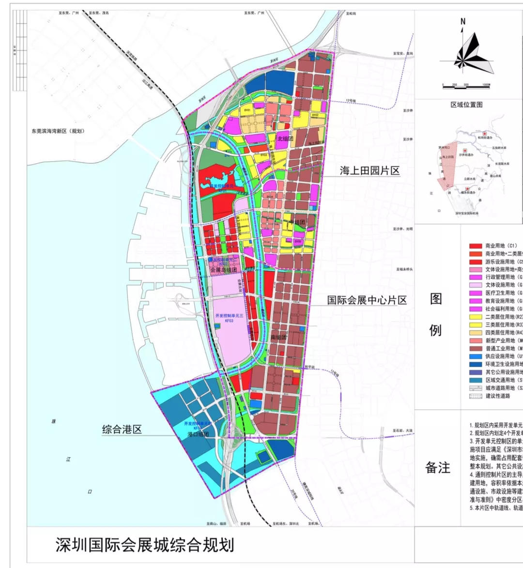 “深圳國際會展城”范圍北抵茅洲河、東至松福大道、南臨福永河、西側(cè)主要以廣深沿江高速公路為界,并包括規(guī)劃寶安綜合港區(qū),范圍共計22.57平方公里,規(guī)劃區(qū)劃分為三個片區(qū):國際會展中心片區(qū)、海上田園片區(qū)和寶安綜合港區(qū)。