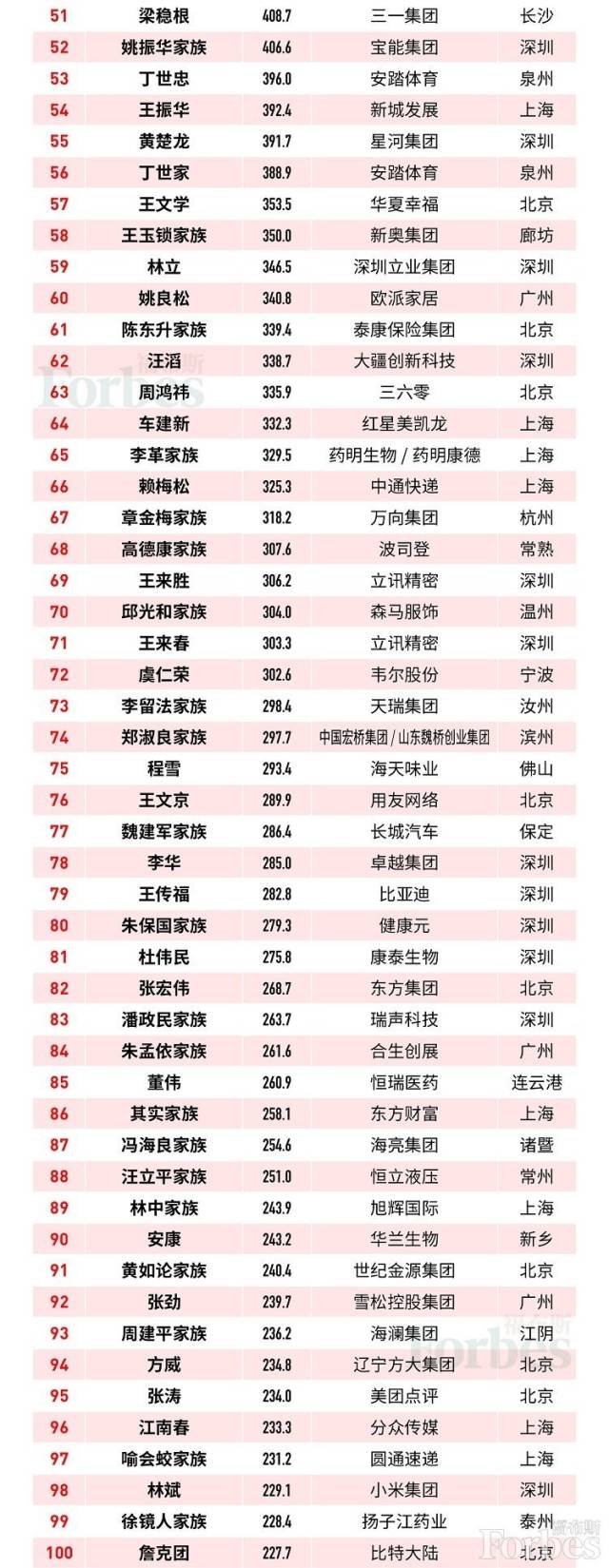 編制本榜單使用的持股和財務(wù)信息取自家族和個人、證交所、分析師和監(jiān)管機(jī)構(gòu)。資產(chǎn)計算使用的是截至10月25日的股價和匯率。非上市公司的估值基于對同類上市公司的分析評估。被抵押股權(quán)予以折價計算。與福布斯全球億萬富豪榜不同,福布斯中國富豪榜包括參與配偶生意的夫婦。一些估算還包括其他家族成員擁有的資產(chǎn)。