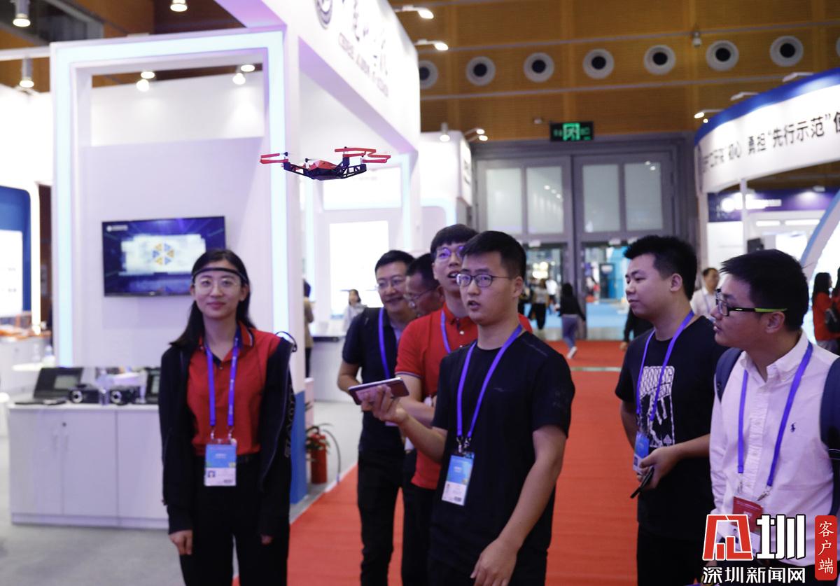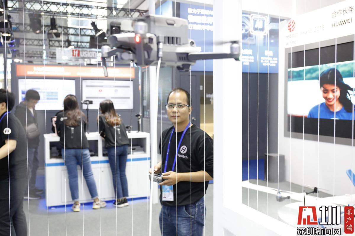 一位展區(qū)工作人員正在操控無人機。
