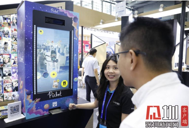 2019年11月13日,深圳會(huì)展中心,一位正在與機(jī)器互動(dòng)的觀眾。該機(jī)器是由臺(tái)灣公司啟云科技設(shè)計(jì),多用在營(yíng)銷(xiāo)領(lǐng)域,用戶可與之互動(dòng)拍出照片。