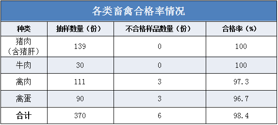 畜禽類產(chǎn)品6份不合格樣品中,禽肉和禽蛋分別檢出3份樣品不合格。