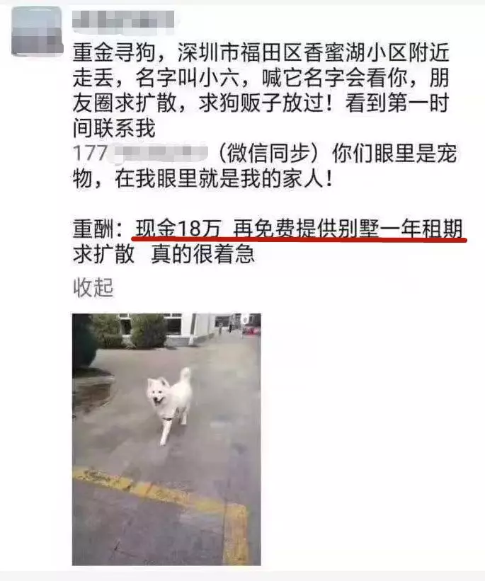 深廣電第一現(xiàn)場2019年11月19日訊 近日,一張“重金尋狗”的朋友圈截圖火了!一位狗主人的朋友圈寫道:狗狗“小六”在福田區(qū)香蜜湖小區(qū)附近走丟,喊它名字會(huì)看你,朋友圈求擴(kuò)散,求狗販子放過!如果幫忙找回重酬現(xiàn)金18萬,再免費(fèi)提供別墅一年租期。
