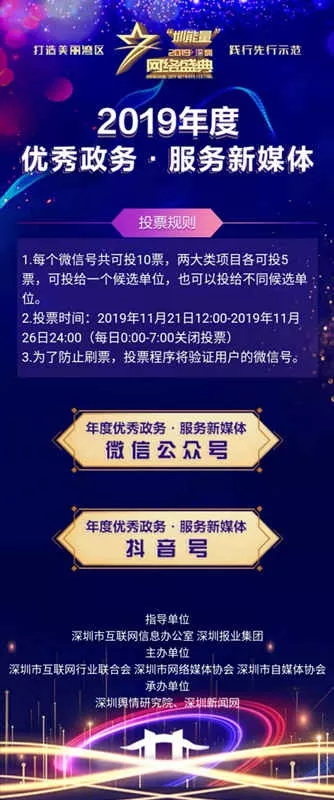 為盤點行業(yè)一年來取得的新探索、新成就、新經驗,唱響主旋律,弘揚正能量,“‘圳能量’2019深圳網絡盛典”——暨深圳年度優(yōu)秀政務·服務新媒體活動將于2019年12月6日隆重舉行。